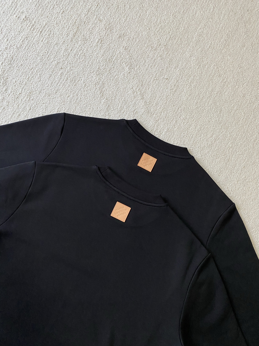采用26支双纱面层+10支纱毛圈底的复合结构,克重380g/㎡ 属重磅级别。面层双纱令布面光洁细密,底层毛圈经起绒形成丰糯绒感,实现外挺括内亲肤的二元质感。搭配21支1×1罗纹克重高达470g/㎡ ,其粗支高密编织带来极强的骨感和回弹力,袖口、下摆收紧时呈现饱满立体形态,抗变形性能远超常规罗纹。整体面料系统以重磅织造+超厚罗纹构筑出雕塑般耐久廓形与云端触感。